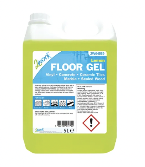 This 2Work Lemon Floor Gel has a powerful concentration to effortlessly eliminate dirt and grime for a hygienic, sanitary surface. The fragrance will leave floors smelling fresh with a zesty lemon scent long after use, suitable for use on all washable floor and hard surfaces. Versatile enough to be used with or without a rotary scrubbing machine. This pack contains one 5 litre bottle.