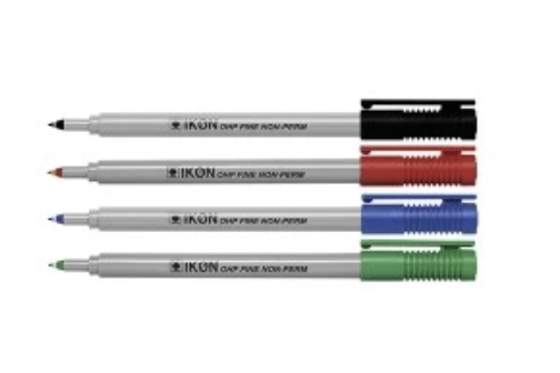 These non-permanent overhead projector pens contain soluble water-based ink that can easily be erased with a damp cloth. Supplied in a wallet of 4, these projector pens have a grey barrel with coloured lids to identify the ink colour. Assorted colours including black, red, blue and green.