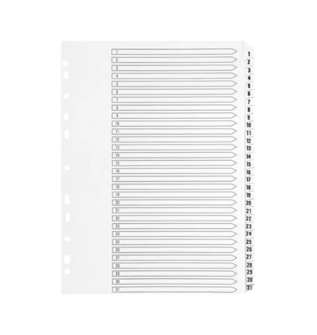 This Q-Connect 1-31 numbered index divider provides a clear and simple filing solution for your everyday office needs. The front index sheet provides space for labelling to make referencing your notes quick and easy. Made from plain white board with clear tabs that are Mylar-coated for extra reinforcement, this index comes with pre-printed tabs (1-31) and is multi-punched to fit standard A4 lever arch files or ring binders.